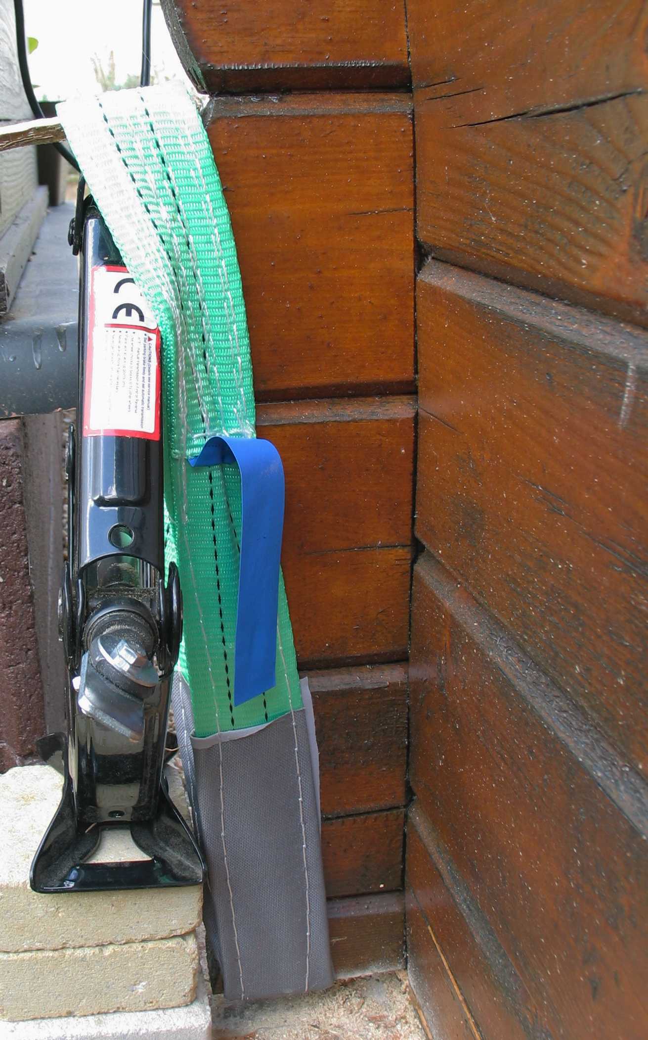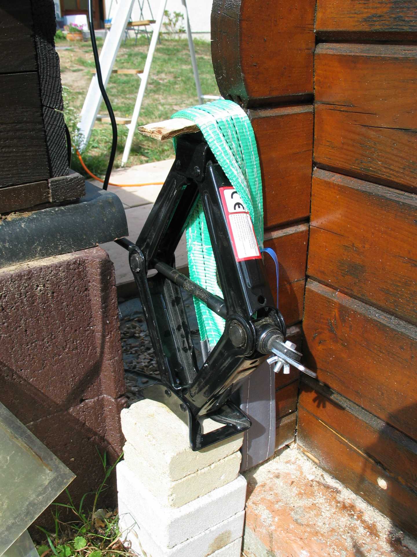 - Actionner le cric pour que celui-ci tire sur la sangle. Le chalet va se soulever.