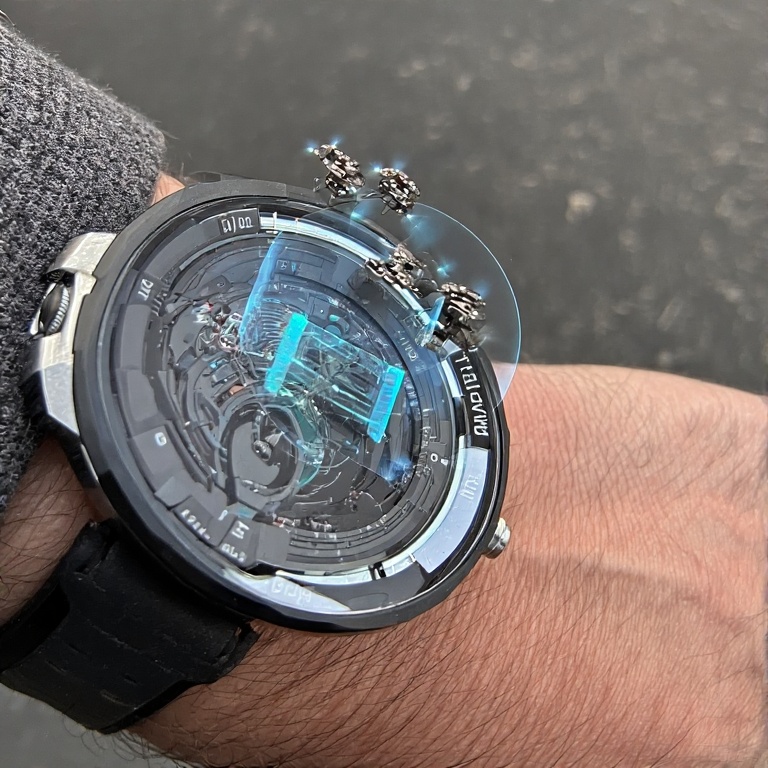 Image généré par IA de montre du futur avec un hologramme et des micro drone